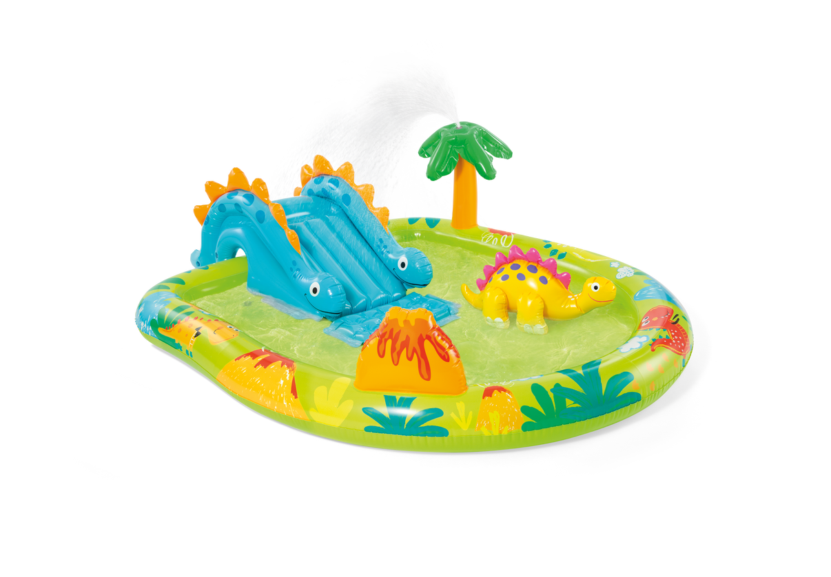 Med denne dinosaur børnepool er der garanteret vandsjov i timevis for de små. Lad dem rutsje ned ad dinosaurrutsjebanen, mens de afkøles af det vandsprøjtende palmetræ, og lad dem lande blødt på den polstrede pude ved dinosauren. Den indbyggede vandsprøjte tilkobles nemt haveslangen. Egnet til børn fra 2 år - dog under voksenopsyn.