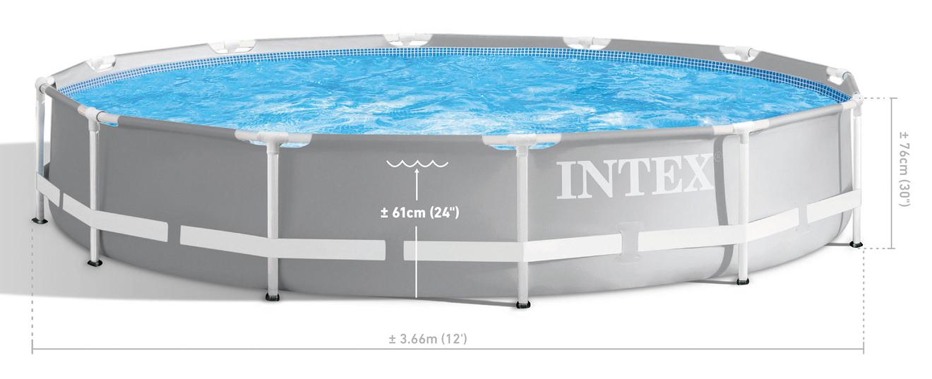 Enjoy hours of fun with water play with the round Prism Frame pool. Including a filter pump from Intex. The pool measures 366 x 76 cm and is easy to set up and ready for use. It holds 6503 liters at 90% capacity and features a sturdy structure made of reinforced steel with a rust-resistant coating. The pool has a solid 3-layer super-tough PVC pool liner and is suitable for both beginners in swimming and festive gatherings with friends and family. Capacity: 6503 liters (at 90%) Flow rate of filter pump: 2006 liters/hour (32 mm connection) It is recommended to add bactericidal chemicals additionally. Placed on a flat surface that can support the weight. The filter pump helps keep the pool clean. and the included pump requires filter type A (included). which must be replaced regularly (29003). The flow rate of the filter pump is 2006 liters per hour. The included filter pump is not compatible with any saltwater systems. but if additional cleaning is desired. you can switch to a sand and saltwater system. These systems require a 38 mm connection. so Intex adapter B is therefore required. Includes: Intex Prism Frame Pool - round frame pool 220-240V filter pump (28604) Filter type A Details: Dimensions: 3.66 x 0.76 m Weight: 25.4 kg Age: from 6 years - but under adult supervision NOTE: This pool cannot be buried! Saltwater system. chlorine. and any additional equipment are not included and are sold separately!