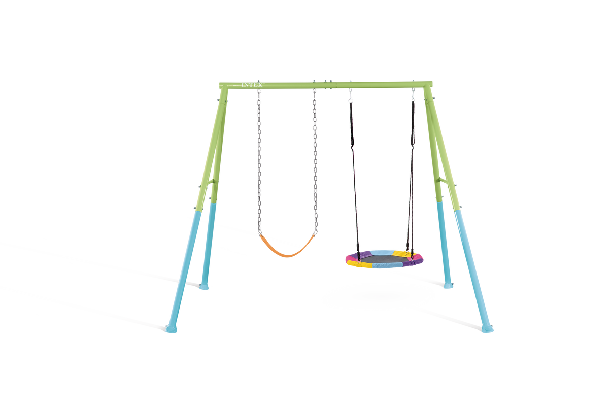Robust double swing set for outdoor use. suitable for children aged 3 to 10 years. The swing frame is made of galvanized. gray-painted steel. which is water- and UV-resistant. ensuring long durability. The set consists of a flexible swing seat with plastic-coated chains. as well as a large nest swing. allowing for both active play and relaxation. The flexible seat has a maximum load capacity of 50 kg. while the nest swing can bear up to 100 kg.