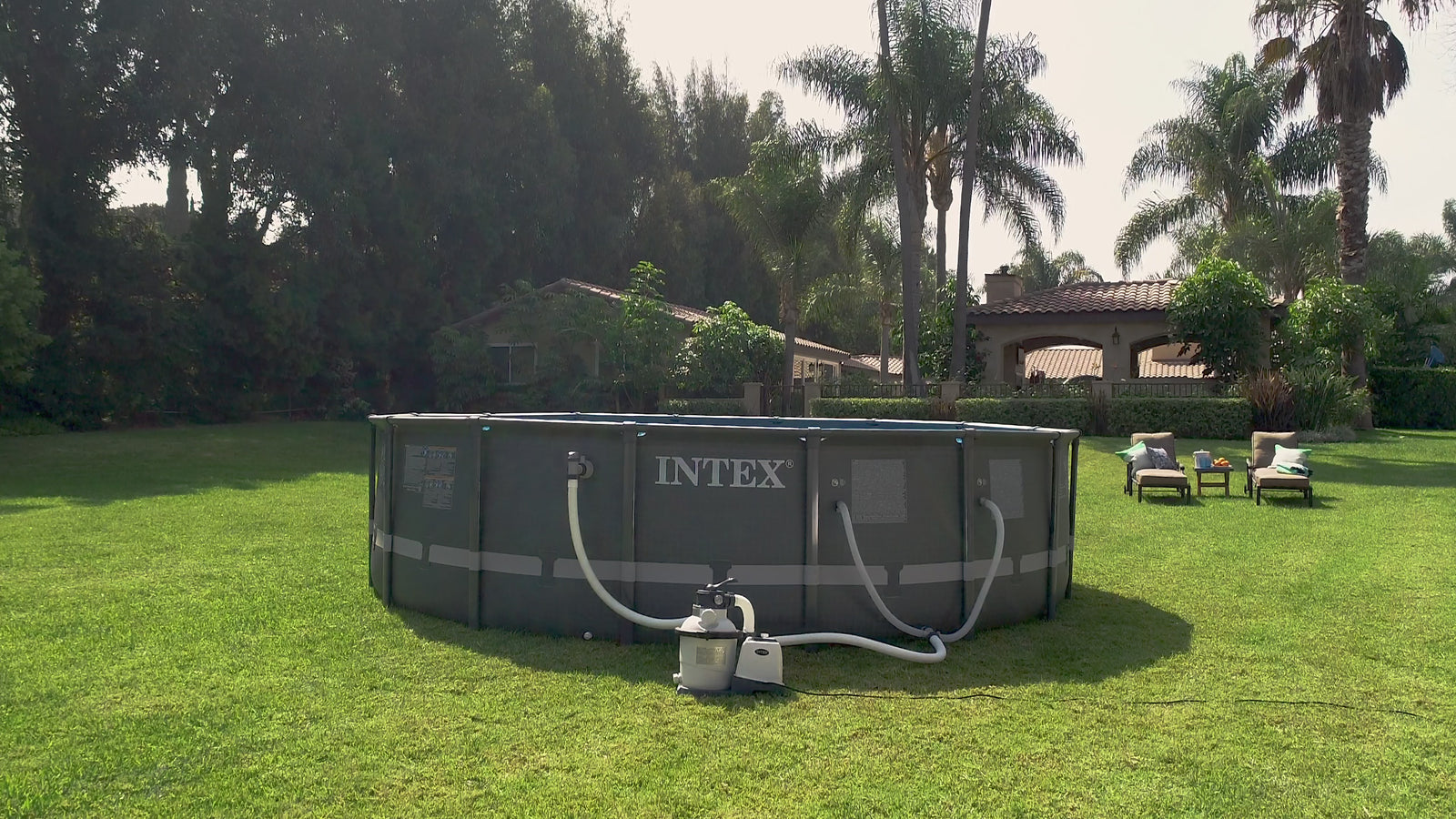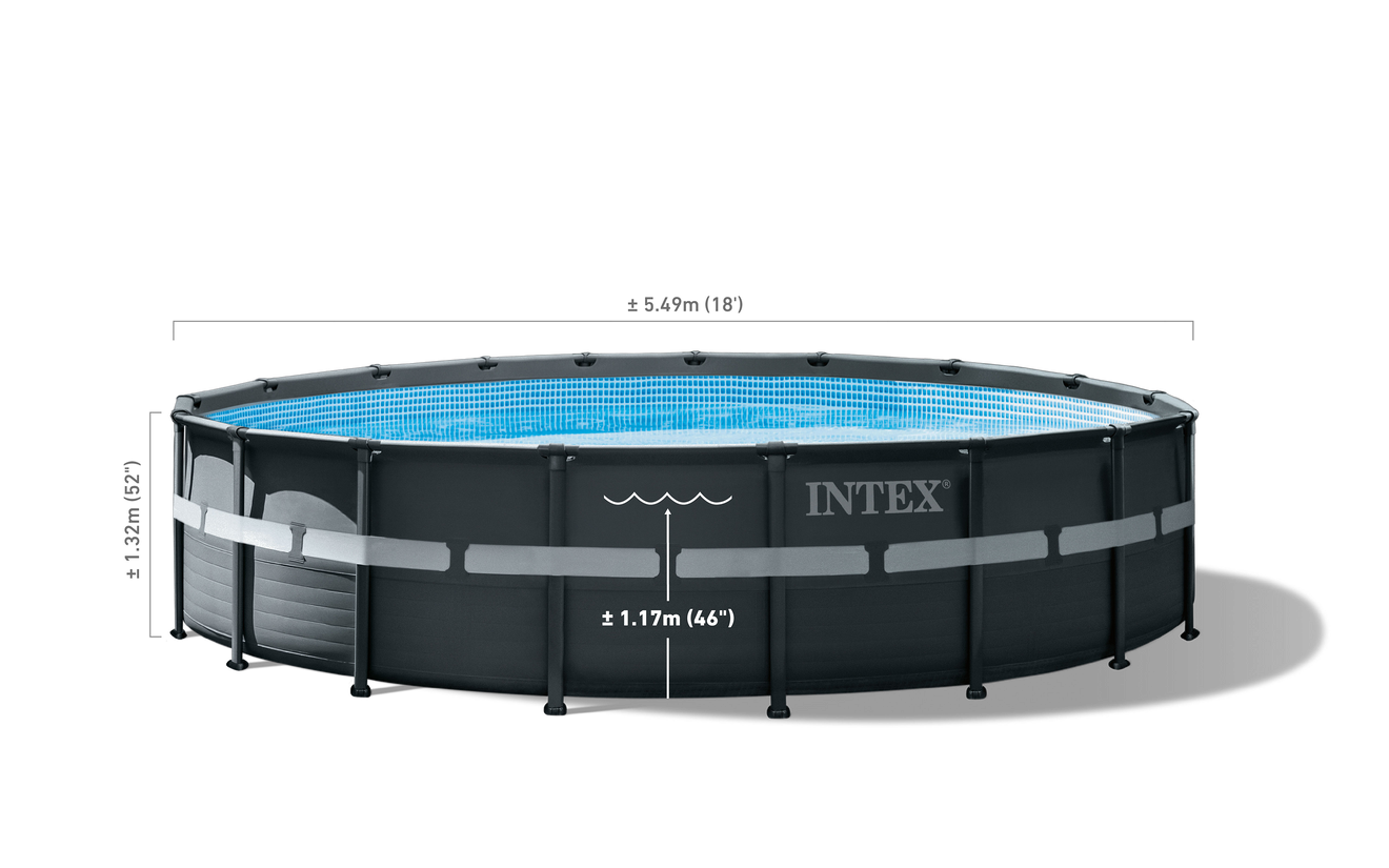 Målene for oppsettet av bassenget er5,49 mx1,32 mDen inneholder26 423liter ved90 %fylling. Sørg for at du har en jevn overflate og ekstra plass til sandfilterpumpen.