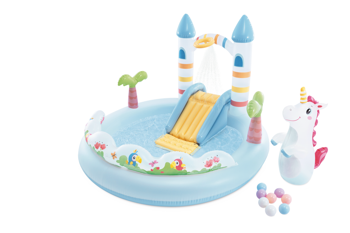 Forvandl hagen til et eventyrlig vannland med Unicorn Castle Play Center. Det fargerike enhjørninge-slottet inviterer til timevis av moro med innebygd sklie. lekne detaljer og et sjarmerende design som umiddelbart fanger barns fantasi. Perfekt for varme sommerdager. hvor lek. latter og avkjøling går hånd i hånd.