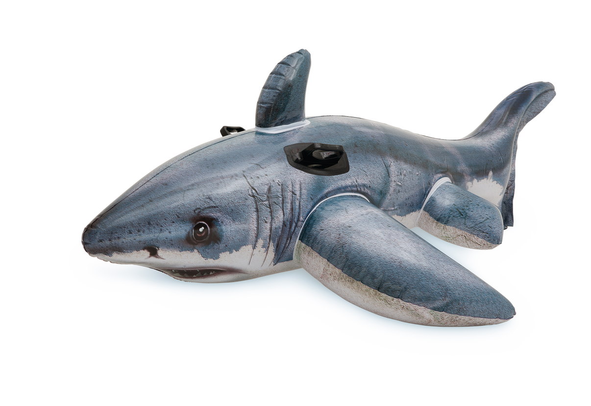 Oppustbar hai fra Intex. Badedyr som brukes til å sitte og flyte rundt i vannlek for barn. Nyt at barna får brent av energien sin i bassenget eller på stranden. Badedyr. oppustbar. hai-design. med to håndtak. Vannlek aktivitet for barn. Slitesterk vinyl. 1.73 x 1.07 meter. Må kun brukes under oppsyn av en voksen.