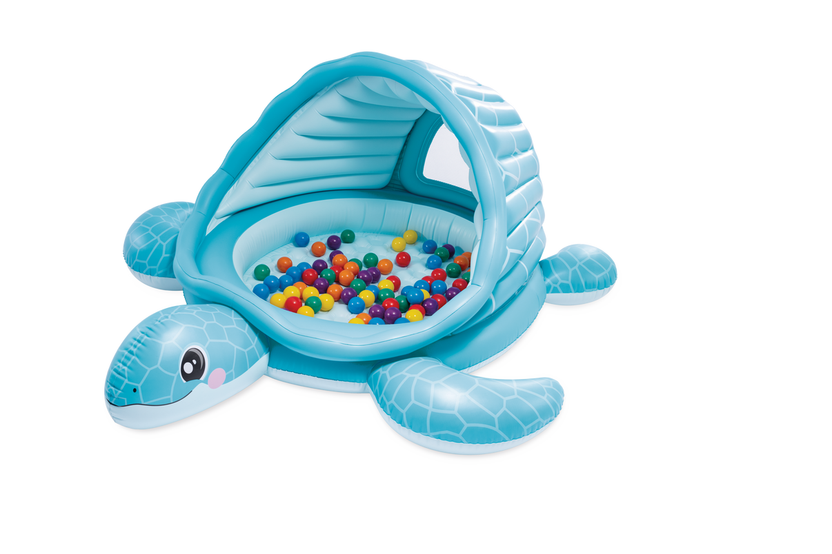 Skapa ett sommarparadis med denna glada. uppblåsbara barnpool formad som en havssköldpadda. Den kan användas som plaskdamm eller bollpool med 100 medföljande bollar. Poolen rymmer 119 liter vatten vid en vägghöjd på 15 cm och har ett avtagbart solskydd. Tillverkad av slitstark och mjuk vinyl som är lätt att blåsa upp. tömma och förvara – idealisk för små utomhusområden.